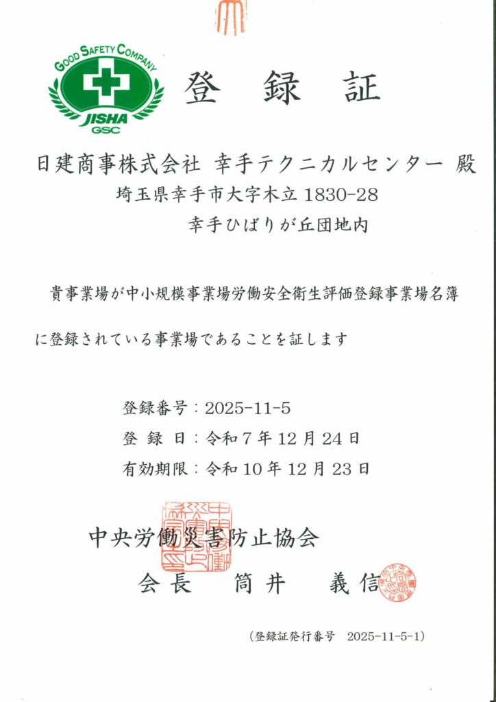 このたび、日建商事株式会社 幸手テクニカルセンターは、 中小規模事業場労働安全衛生評価事業「グッド・セイフティ・カンパニー」 に正式登録されましたので、お知らせいたします。